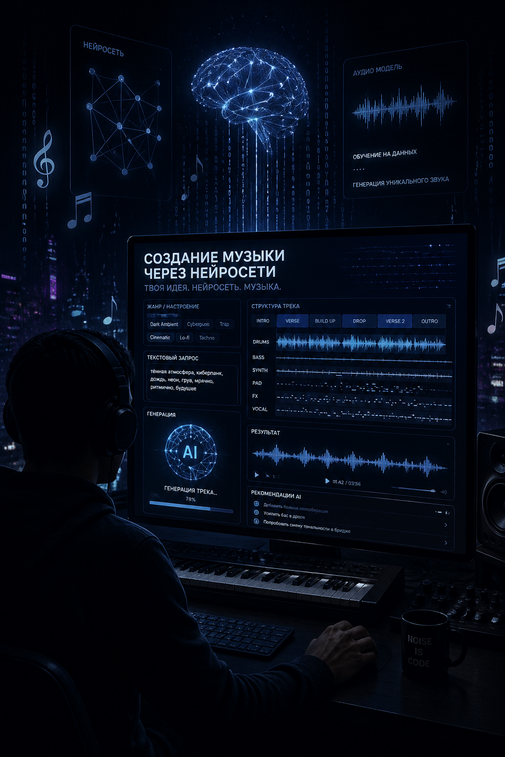 Предлагаю создание авторских песен и музыки с помощью нейросетей. Помогу воплотить ваши музыкальные идеи в уникальные современные треки любого жанра — быстро, креативно и эксклюзивно.