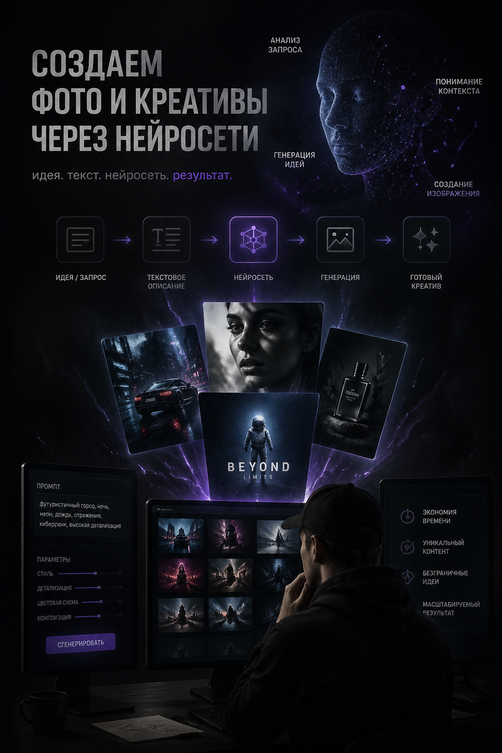 Предлагаю услуги по созданию уникальных фото, нейрофотосессий и креативов с использованием современных нейросетей. Вы получите эксклюзивные, стильные изображения и оригинальные визуальные решения для любых задач — от личных портретов до бизнес-контента.